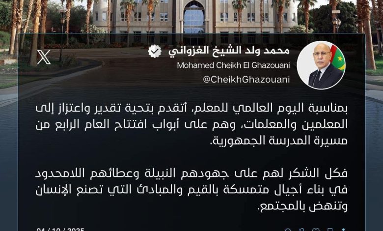 الرئيس الموريتاني محمد ولد الشيخ الغزواني يهنئ المعلمين بمناسبة اليوم العالمي للمعلم ويثمن جهودهم في بناء الأجيال